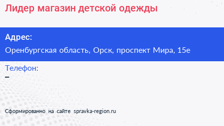 Лидер, магазин детской одежды по адресу Оренбургская область, Орск, проспект Мира, 15е в дальнейшем Организация, размещена в следующих категориях: