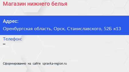Магазин нижнего белья по адресу Оренбургская область, Орск, Станиславского, 52Б к13 в дальнейшем Организация, размещена в следующих категориях: