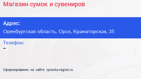 Магазин сумок и сувениров по адресу Оренбургская область, Орск, Краматорская, 35 в дальнейшем Организация, размещена в следующих категориях:
