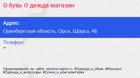 О`бувь & О`дежда, магазин по адресу Оренбургская область, Орск, Щорса, 4Б в дальнейшем Организация, размещена в следующих категориях: