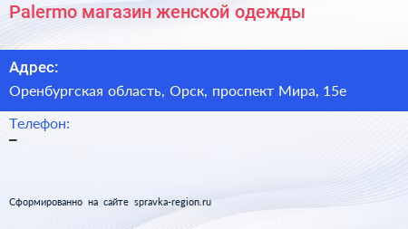 Palermo, магазин женской одежды по адресу Оренбургская область, Орск, проспект Мира, 15е в дальнейшем Организация, размещена в следующих категориях: