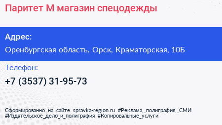 Паритет-М, магазин спецодежды по адресу Оренбургская область, Орск, Краматорская, 10Б в дальнейшем Организация, размещена в следующих категориях:
