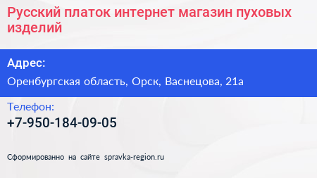 Русский платок, интернет-магазин пуховых изделий по адресу Оренбургская область, Орск, Васнецова, 21а в дальнейшем Организация, размещена в следующих категориях: