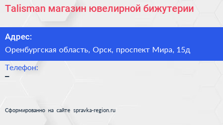 Talisman, магазин ювелирной бижутерии по адресу Оренбургская область, Орск, проспект Мира, 15д в дальнейшем Организация, размещена в следующих категориях:
