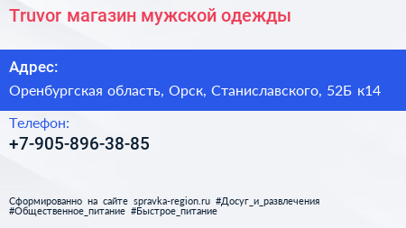 Truvor, магазин мужской одежды по адресу Оренбургская область, Орск, Станиславского, 52Б к14 в дальнейшем Организация, размещена в следующих категориях: