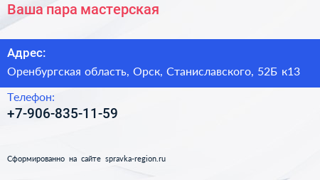 Ваша пара, мастерская по адресу Оренбургская область, Орск, Станиславского, 52Б к13 в дальнейшем Организация, размещена в следующих категориях:
