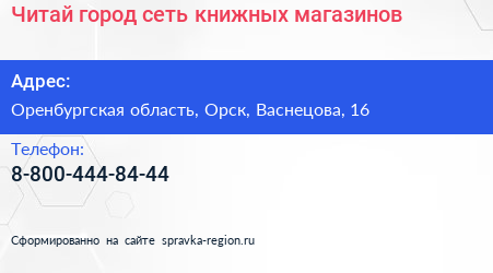 Читай-город, сеть книжных магазинов по адресу Оренбургская область, Орск, Васнецова, 16 в дальнейшем Организация, размещена в следующих категориях:
