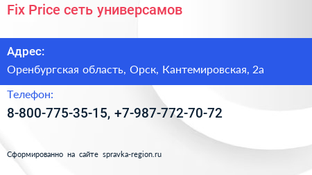Fix Price, сеть универсамов по адресу Оренбургская область, Орск, Кантемировская, 2а в дальнейшем Организация, размещена в следующих категориях: