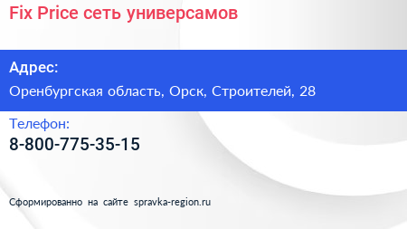 Fix Price, сеть универсамов по адресу Оренбургская область, Орск, Строителей, 28 в дальнейшем Организация, размещена в следующих категориях: