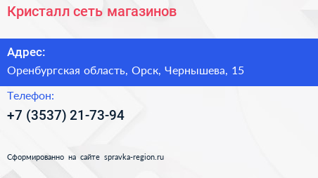 Кристалл, сеть магазинов по адресу Оренбургская область, Орск, Чернышева, 15 в дальнейшем Организация, размещена в следующих категориях: