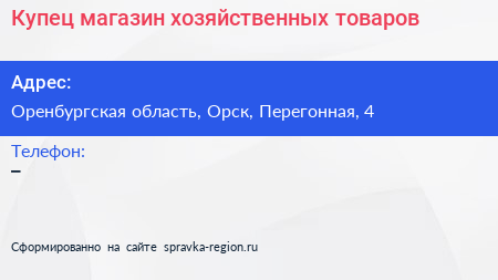 Купец, магазин хозяйственных товаров по адресу Оренбургская область, Орск, Перегонная, 4 в дальнейшем Организация, размещена в следующих категориях: