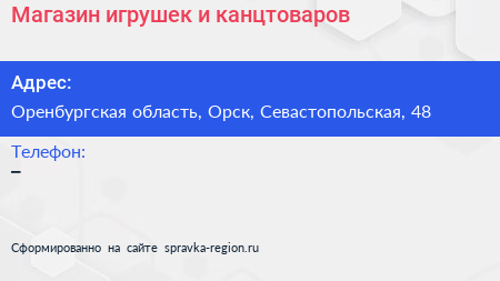 Магазин игрушек и канцтоваров по адресу Оренбургская область, Орск, Севастопольская, 48 в дальнейшем Организация, размещена в следующих категориях: