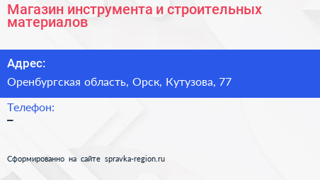 Магазин инструмента и строительных материалов по адресу Оренбургская область, Орск, Кутузова, 77 в дальнейшем Организация, размещена в следующих категориях: