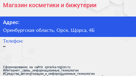 Магазин косметики и бижутерии по адресу Оренбургская область, Орск, Щорса, 4Б в дальнейшем Организация, размещена в следующих категориях: