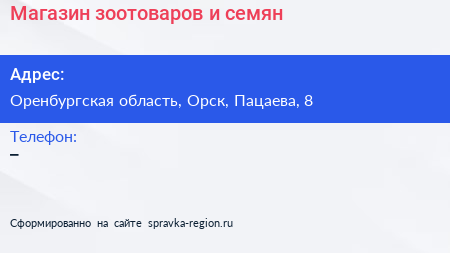 Магазин зоотоваров и семян по адресу Оренбургская область, Орск, Пацаева, 8 в дальнейшем Организация, размещена в следующих категориях: