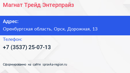 Магнат Трейд Энтерпрайз по адресу Оренбургская область, Орск, Дорожная, 13 в дальнейшем Организация, размещена в следующих категориях: