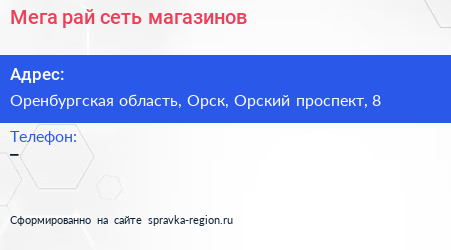 Мега рай, сеть магазинов по адресу Оренбургская область, Орск, Орский проспект, 8 в дальнейшем Организация, размещена в следующих категориях: