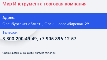 Мир Инструмента, торговая компания по адресу Оренбургская область, Орск, Новосибирская, 29 в дальнейшем Организация, размещена в следующих категориях: