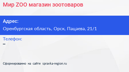 Мир ZOO, магазин зоотоваров по адресу Оренбургская область, Орск, Пацаева, 21/1 в дальнейшем Организация, размещена в следующих категориях: