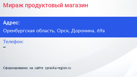 Мираж, продуктовый магазин по адресу Оренбургская область, Орск, Доронина, 69а в дальнейшем Организация, размещена в следующих категориях: