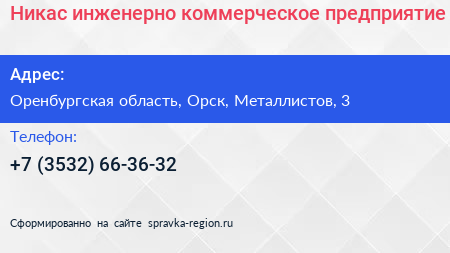 Никас, инженерно-коммерческое предприятие по адресу Оренбургская область, Орск, Металлистов, 3 в дальнейшем Организация, размещена в следующих категориях: