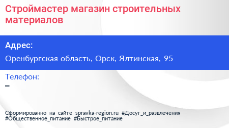 Строймастер, магазин строительных материалов по адресу Оренбургская область, Орск, Ялтинская, 95 в дальнейшем Организация, размещена в следующих категориях: