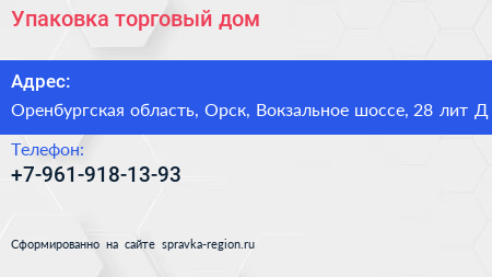 Упаковка, торговый дом по адресу Оренбургская область, Орск, Вокзальное шоссе, 28 лит Д в дальнейшем Организация, размещена в следующих категориях: