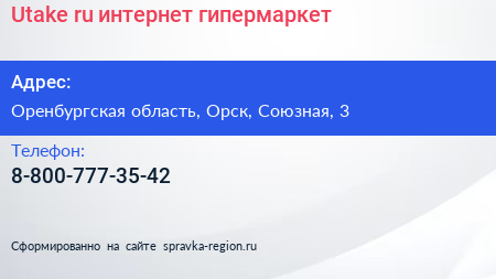 Utake.ru, интернет-гипермаркет по адресу Оренбургская область, Орск, Союзная, 3 в дальнейшем Организация, размещена в следующих категориях: