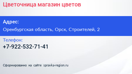 Цветочница, магазин цветов по адресу Оренбургская область, Орск, Строителей, 2 в дальнейшем Организация, размещена в следующих категориях: