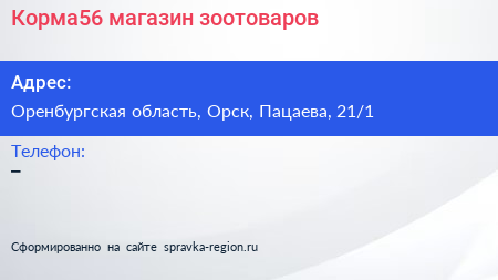 Корма56, магазин зоотоваров по адресу Оренбургская область, Орск, Пацаева, 21/1 в дальнейшем Организация, размещена в следующих категориях: