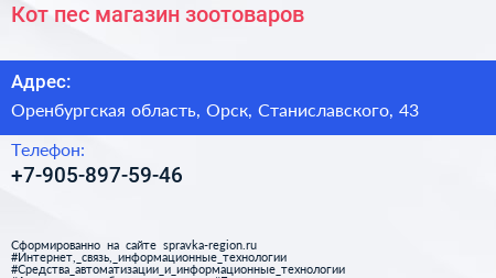 Кот & пес, магазин зоотоваров по адресу Оренбургская область, Орск, Станиславского, 43 в дальнейшем Организация, размещена в следующих категориях: