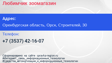 Любимчик, зоомагазин по адресу Оренбургская область, Орск, Строителей, 30 в дальнейшем Организация, размещена в следующих категориях: