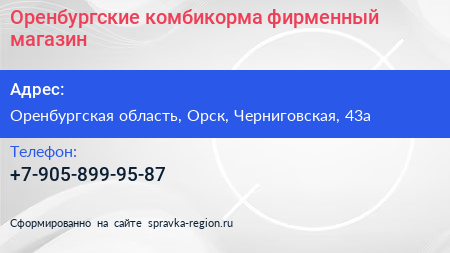Оренбургские комбикорма, фирменный магазин по адресу Оренбургская область, Орск, Черниговская, 43а в дальнейшем Организация, размещена в следующих категориях: