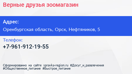 Верные друзья, зоомагазин по адресу Оренбургская область, Орск, Нефтяников, 5 в дальнейшем Организация, размещена в следующих категориях: