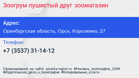 Зоогрум пушистый друг, зоомагазин по адресу Оренбургская область, Орск, Короленко, 27 в дальнейшем Организация, размещена в следующих категориях: