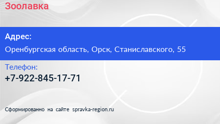 Зоолавка по адресу Оренбургская область, Орск, Станиславского, 55 в дальнейшем Организация, размещена в следующих категориях:
