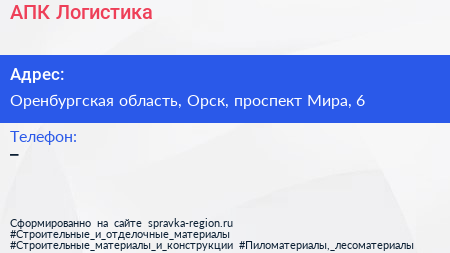 АПК-Логистика по адресу Оренбургская область, Орск, проспект Мира, 6 в дальнейшем Организация, размещена в следующих категориях: