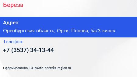 Береза по адресу Оренбургская область, Орск, Попова, 5а/3 киоск в дальнейшем Организация, размещена в следующих категориях: