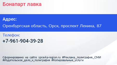 Бонапарт, лавка по адресу Оренбургская область, Орск, проспект Ленина, 87 в дальнейшем Организация, размещена в следующих категориях: