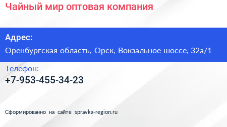Чайный мир, оптовая компания по адресу Оренбургская область, Орск, Вокзальное шоссе, 32а/1 в дальнейшем Организация, размещена в следующих категориях: