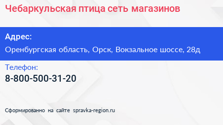Чебаркульская птица, сеть магазинов по адресу Оренбургская область, Орск, Вокзальное шоссе, 28д в дальнейшем Организация, размещена в следующих категориях: