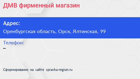 ДМВ, фирменный магазин по адресу Оренбургская область, Орск, Ялтинская, 99 в дальнейшем Организация, размещена в следующих категориях: