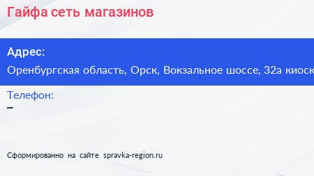 Гайфа, сеть магазинов по адресу Оренбургская область, Орск, Вокзальное шоссе, 32а киоск в дальнейшем Организация, размещена в следующих категориях: