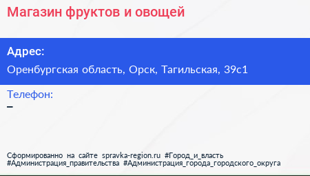 Магазин фруктов и овощей по адресу Оренбургская область, Орск, Тагильская, 39с1 в дальнейшем Организация, размещена в следующих категориях: