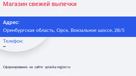 Магазин свежей выпечки по адресу Оренбургская область, Орск, Вокзальное шоссе, 28/5 в дальнейшем Организация, размещена в следующих категориях: