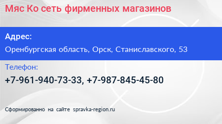 Мяс-Ко, сеть фирменных магазинов по адресу Оренбургская область, Орск, Станиславского, 53 в дальнейшем Организация, размещена в следующих категориях: