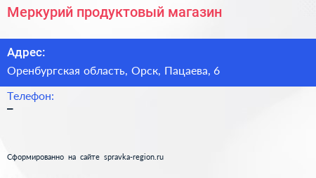 Меркурий, продуктовый магазин по адресу Оренбургская область, Орск, Пацаева, 6 в дальнейшем Организация, размещена в следующих категориях: