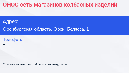 ОНОС, сеть магазинов колбасных изделий по адресу Оренбургская область, Орск, Беляева, 1 в дальнейшем Организация, размещена в следующих категориях: