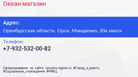 Океан, магазин по адресу Оренбургская область, Орск, Макаренко, 20а киоск в дальнейшем Организация, размещена в следующих категориях: