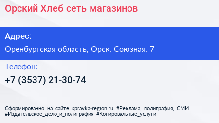 Орский Хлеб, сеть магазинов по адресу Оренбургская область, Орск, Союзная, 7 в дальнейшем Организация, размещена в следующих категориях: